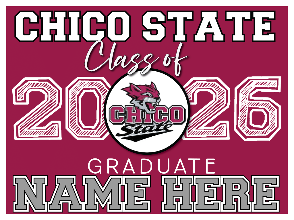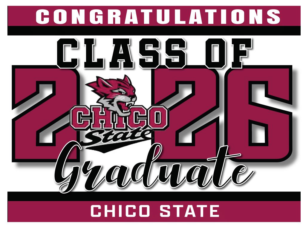 CHICO STATE UNIVERSITY- CHICO, CA All signs are 24″ wide x 18″ high and come with an H-stake New! Custom Design Graduation Signs with photo and H-Stake $28 each These are samples, we will change the logos and high school names to match your school. Click here to order Click here to order BACK TO SCHOOL SELECTION PAGE Regular Rectangle Signs with H-Stake $18 each Click here to purchase Click here to purchase Click here to purchase