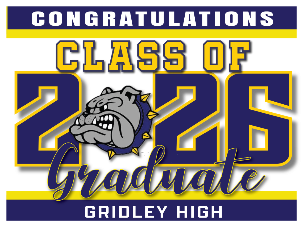 GRIDLEY HIGH SCHOOL-GRIDLEY, CA All signs are 24″ wide x 18″ high and come with an H-stake New! Custom Design Graduation Signs with photo and H-Stake $28 each These are samples, we will change the logos and high school names to match your school. Click here to order Click here to order Regular Rectangle Signs with H-Stake $18 each BACK TO SCHOOL SELECTION PAGE Click here to purchase Click here to purchase Click here to purchase