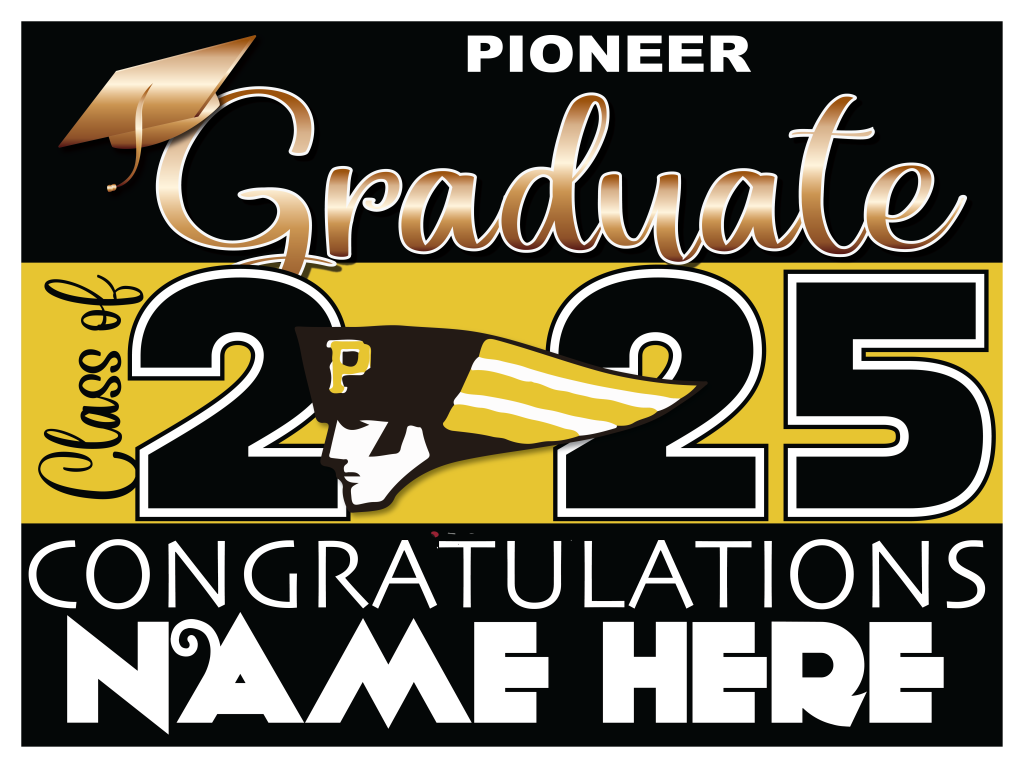 PIONEER HIGH SCHOOL-WOODLAND, CA All signs are 24″ wide x 18″ high and come with an H-stake BACK TO SCHOOL SELECTION PAGE New! Custom Design Graduation Signs with photo and H-Stake $28 each These are samples, we will change the logos and high school names to match your school. Click here to order Click here to order Regular Rectangle Signs with H-Stake $18 each Click here to purchase Click here to purchase Click here to purchase