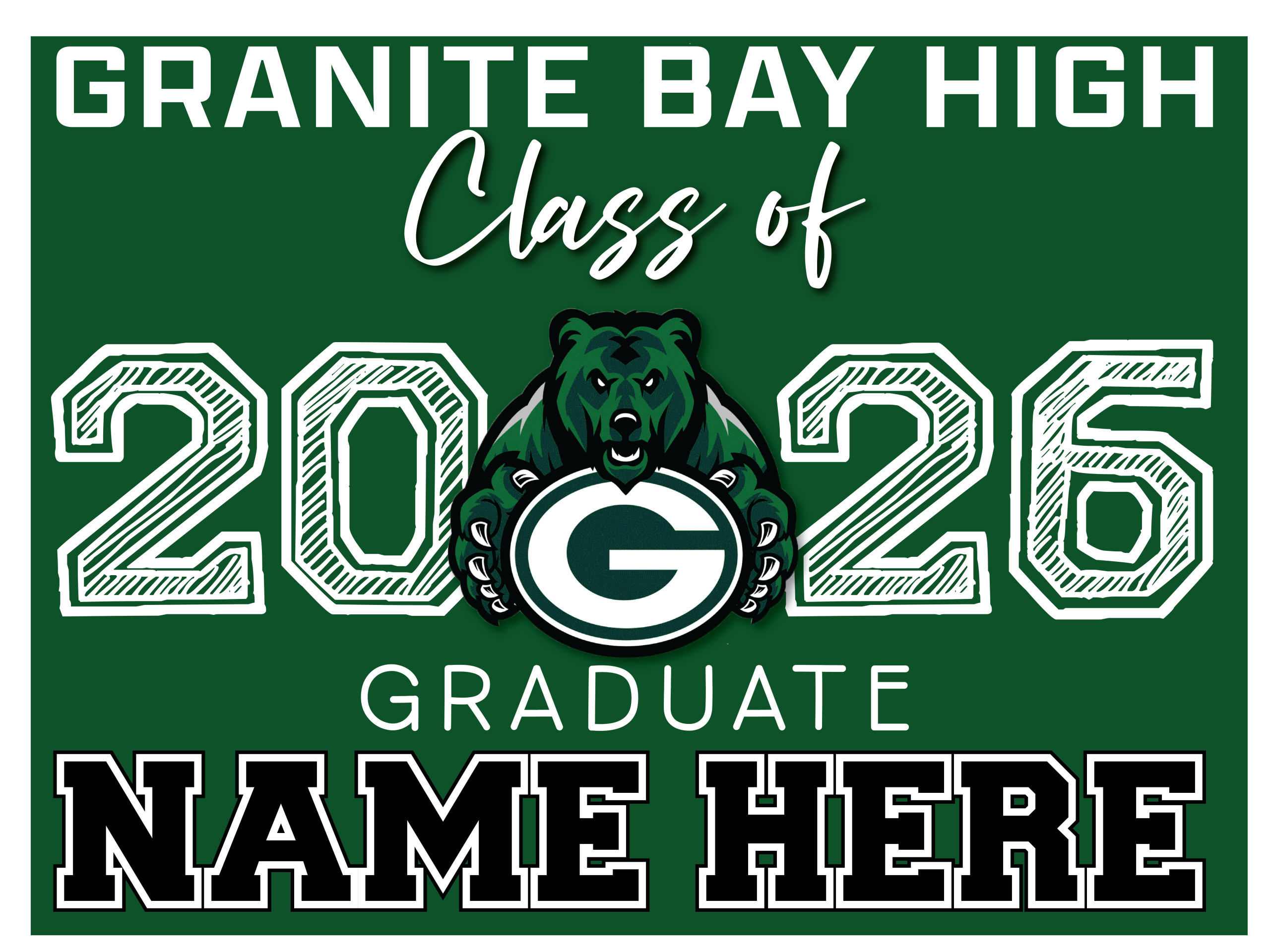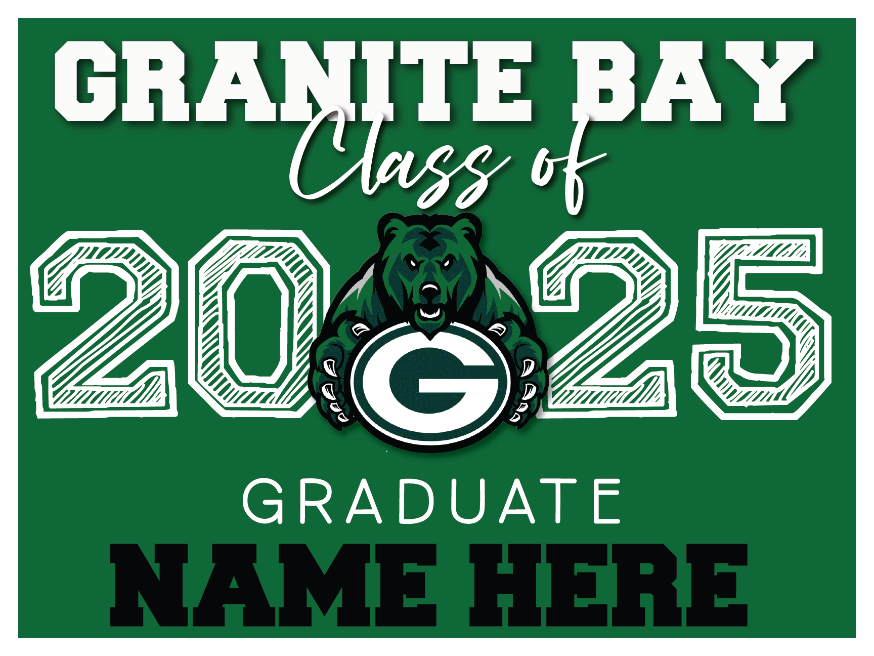 GRANITE BAY HIGH SCHOOL GRADUATION SIGNS 002$18.00 Granite Bay High School Graduation Sign 18″x24″ sign with a metal H stake GRANITE BAY HIGH SCHOOL GRADUATION SIGNS 002 quantity Add to cart Categories: Customizable, graduation Signs, School Spirit Products Description Additional information Description Back Additional information Weight 1.5 lbs Dimensions 25 × 19 × 1 in
