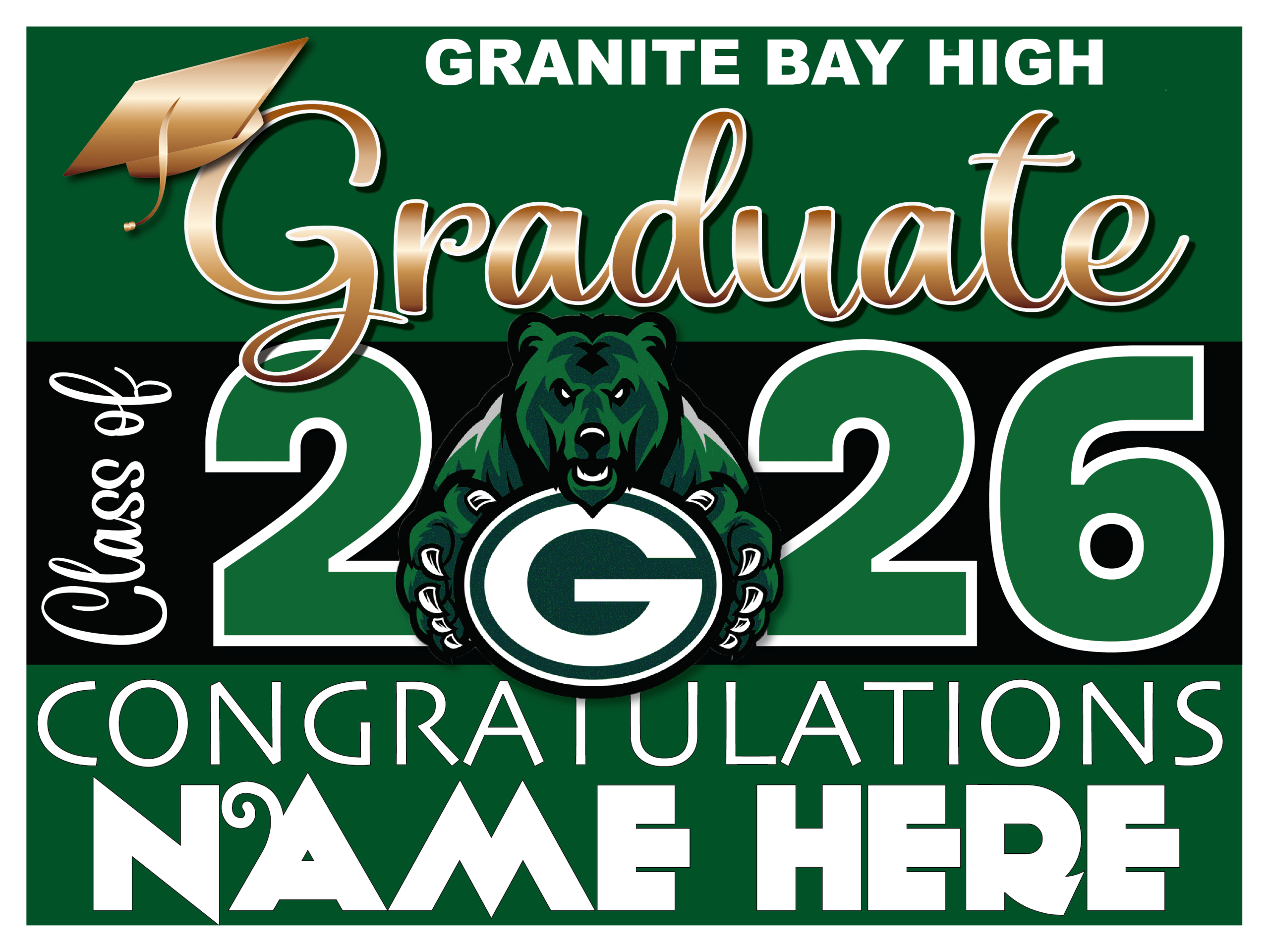 GRANITE BAY HIGH SCHOOL GRADUATION SIGNS 003$18.00 Granite Bay High School Graduation Sign 18″x24″ sign with a metal H stake GRANITE BAY HIGH SCHOOL GRADUATION SIGNS 003 quantity Add to cart Categories: Customizable, graduation Signs, School Spirit Products Description Additional information Description Back Additional information Weight 1.5 lbs Dimensions 25 × 19 × 1 in