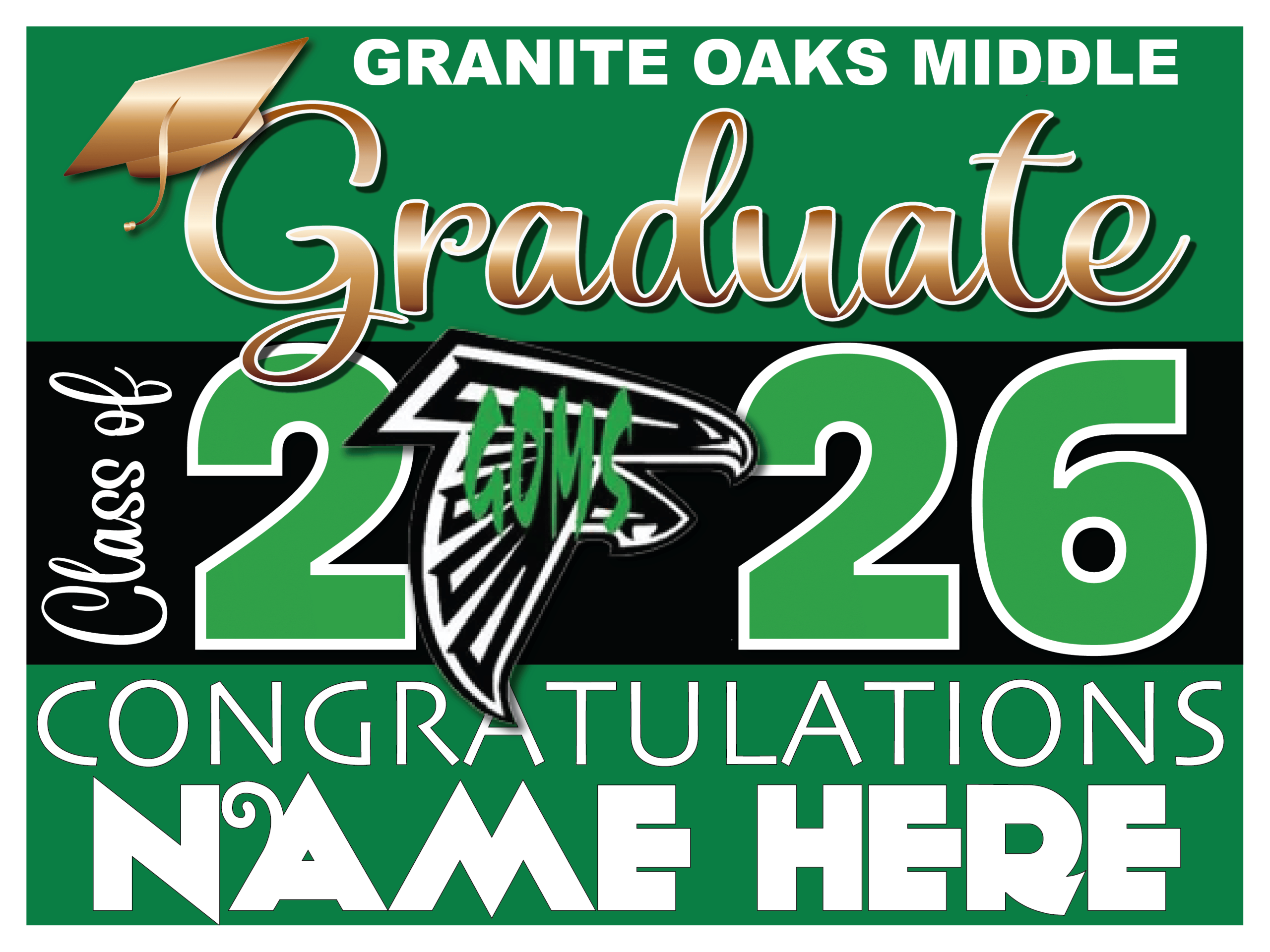 GRANITE OAKS MIDDLE SCHOOL GRADUATION SIGNS 003$18.00 Granite Oaks Middle School Graduation Sign 18″x24″ sign with a metal H stake GRANITE OAKS MIDDLE SCHOOL GRADUATION SIGNS 003 quantity Add to cart Categories: Customizable, graduation Signs, School Spirit Products Description Additional information Description Back Additional information Weight 1.5 lbs Dimensions 25 × 19 × 1 in